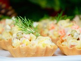 Для разнообразия предлагаю салат Оливье подать в тарталетках, это очень удобно, особенно если вы планируете фуршет, а не застолье. И удобно, и привычный всем салатик смотрится по-новому!