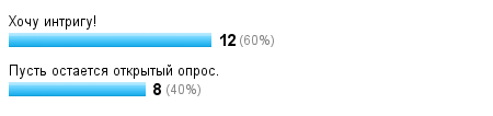 Я тут подумала, может сделать опрос закрытым? Пусть в воздухе повисит интрига на время голосования. А после его окончания я буду его открывать.