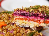 Последний слой – это тертая свекла с угадайте чем, правильно, майонезом!) Практически готовый салат засыпаем тертыми грецкими орехами и украшаем зеленью или еще чем-то на ваш вкус. Салат должен настояться и пропитаться в течении нескольких часов, в моем случае это была целая ночь! Салат прилучается потрясающе вкусным и очень сытным! Красивый и праздничным!