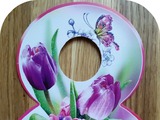 Прелестная открыточка в виде восьмерки с нежными цветочками и поздравлениями от Танечки на обратной стороне