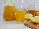 Получившуюся смесь переливаем в графин и остужаем до теплого состояния. Выдавливаем в графин сок лимона. При этом у нас смесь поменяла цвет с насыщенного оранжевого до желтого. Добавляем мед. Хорошо перемешиваем.