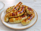 Я запекаю колбаски в духовке. Лучше их ставить в холодную духовку и только потом включать нагрев. Если поставить сразу в горячую, есть вероятность что они лопнут. В духовке включаю режим без конвекции, 180 градусов 40-50 минут. В последние минут 10 можно включить режим гриль, если колбаски получились не достаточно золотистые.