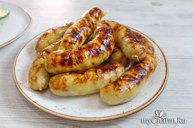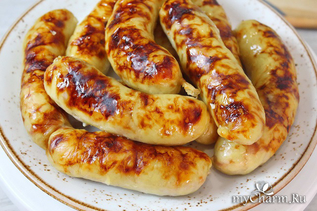 Такие колбаски также можно предварительно отварить, обсушить от влаги, а потом пожарить на сковороде с растительным маслом.