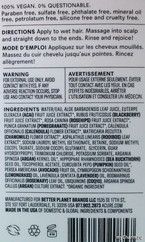 Для мытья волос выбираю мягкие шампуни,без сульфатов.Например,сейчас это шампунь от Acure,ниже на фото его состав.Много экстрактов растений,мягкие ПАВы,капля масел.Он отлично промывает волосы.Считаю,что выбор шампуня очень важен,ведь он непосредственно соприкасается с кожей головы.От здоровья кожи головы зависит сила и красота волос.Если луковицы слабые,истощённые,то и волосы растут ломкие,тонкие,выпадают чаще,чем обновляются.