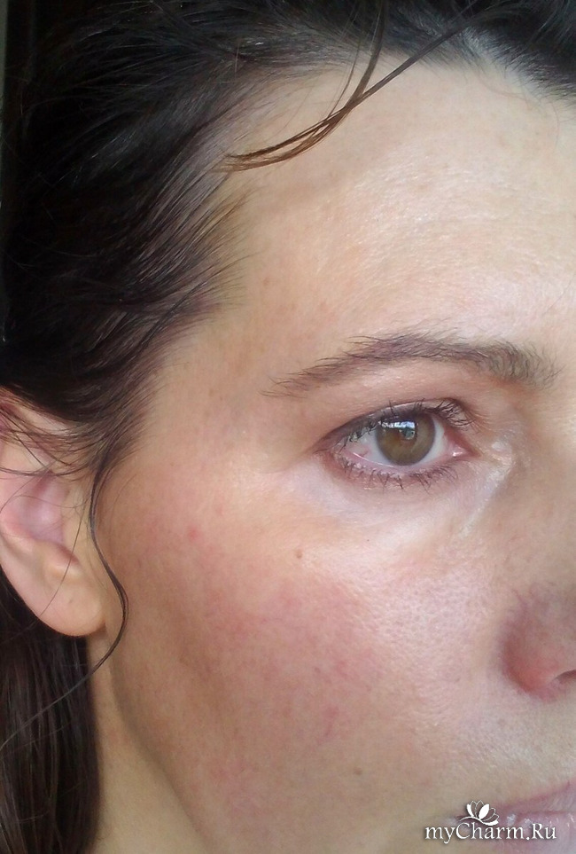 Здесь флюид от Avene нанесен на лицо тонким слоем, поверх всех моих дневных водных сывороток. Отлично растушёвывается, почти не заметен на коже, не проваливается в поры, коже комфортно, она дышит. Мой купероз флюид не маскирует, он виден. Настолько прозрачная текстура у него. В этом главное отличие кремов от флюидов.