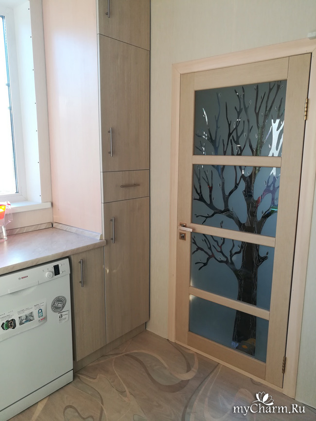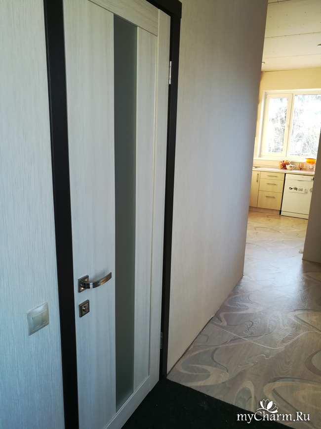 Совпадение цвета фасадов и двери - приятная неожиданность, так же как и совпадение цвета боковины шкафа и наличников двери.
