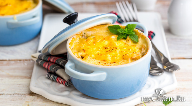 - Засыпать содержимым кокотницу и поставить в духовку. Запекать 10 минут при 180 градусах.
