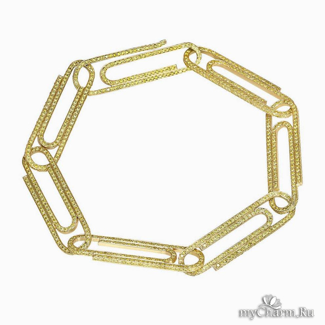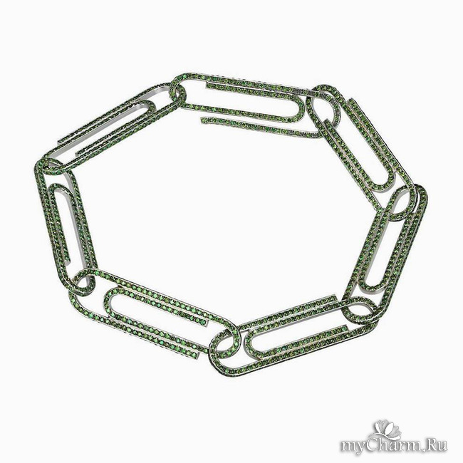 В результате совместной работы были созданы зажимы для денег, серьги, ожерелья и браслеты, выполненные в белом, желтом и розовом золоте. Главной особенностью этих офисных украшений является декор: каждый элемент коллекции усыпан бесцветными, зелеными или желтыми бриллиантами. Все желающие приобрести украшения должны иметь в виду, что они производятся исключительно на заказ, так что с момента оформления придется ждать от шести до восьми недель.