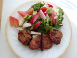 А пока мясо жарилось, сделала весенний салат: огурчик, редиска, помидорки и листья салата.
