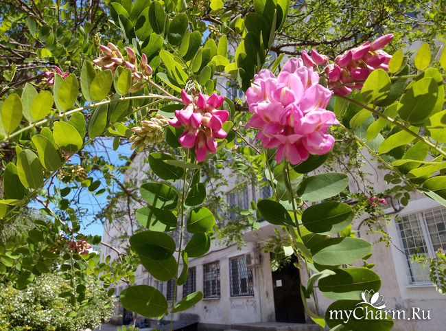 А сегодня меня порадовала розовая акация, она у нас очень редкая.