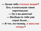 "Дочке 6 лет. Была в гостях в деревне. Проснувшись утром всегда бежала в хоз. двор и собирала яички у курочек. И вот, в одно такое утро, идёт она с этого двора, ноги враскорячку, штаны свисают до колен, подходит к деду и смотрит на него. Естественно, дед спрашивает её: "а что у тебя в штанах?", она тут же достаёт из штанов два куриных яйца, смотрит на деда и выдаёт: "дед, как ты с ними ходишь?"