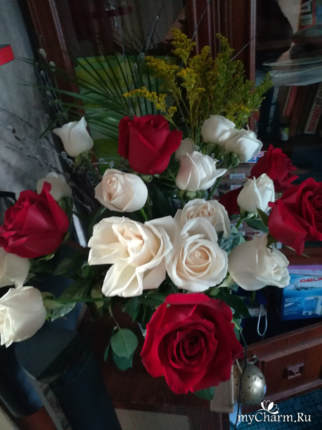 А эти чудесные розы я получила на свой ДР. От мужа - красные, а молодой человек дочери прислал букет белых роз.