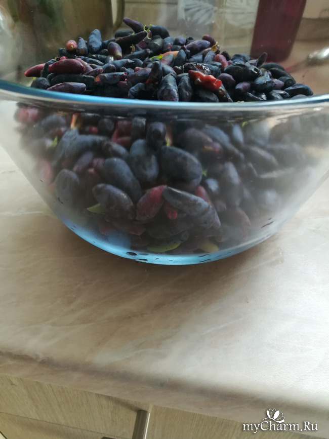 Урожай жимолости. Много ягод оббило дождём. Но оставшаяся ягода просто бесподобно вкусная))