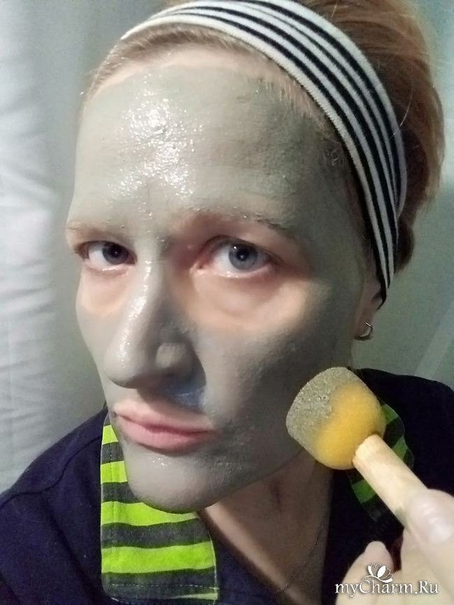 Наношу маску своим специальным спонжиком... равномерно... избегая области глаз и губ...