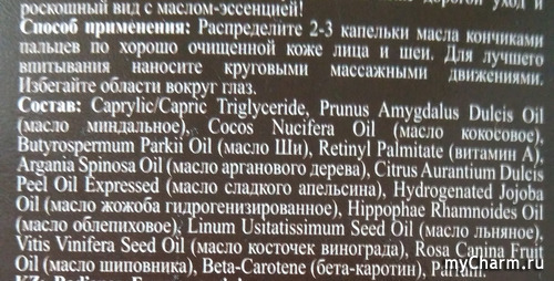 Объем 35 мл, и это много, так как по рекомендации на одно использование достаточно нескольких капель. Масло имеет негустую легкую консистенцию, хорошо наносится на кожу ( предварительно очищенную) и быстро впитывается. Сначала кончиками пальцев распределяю на лице и шее, завершаю круговыми массажными движениями - как и рекомендовано производителем.