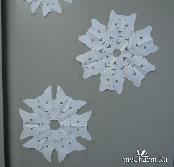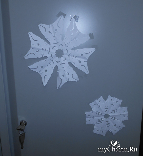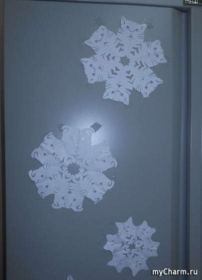 А такие снежинки я вырезала и клеила на окно на молоко, чтобы потом без усилия их снимать. Своим дочкам,