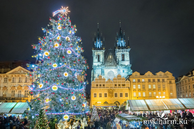 Особенно в этом году сияет пражская елка. Тысячи маленьких огоньков украшают новогоднее дерево на Староместской площади, а чешский Дед Мороз, святой Микулаш с крестом на шапке, раздает конфеты детям, которые хорошо себя вели в этом году.