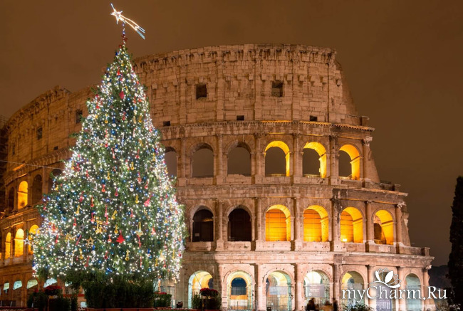 Елка в столице Италии отличается от других европейских красавиц хотя бы тем, что за ней открывается панорама на Колизей. Пушистая ель усеяна маленькими игрушками и огоньками в лучших традициях католического Рождества.