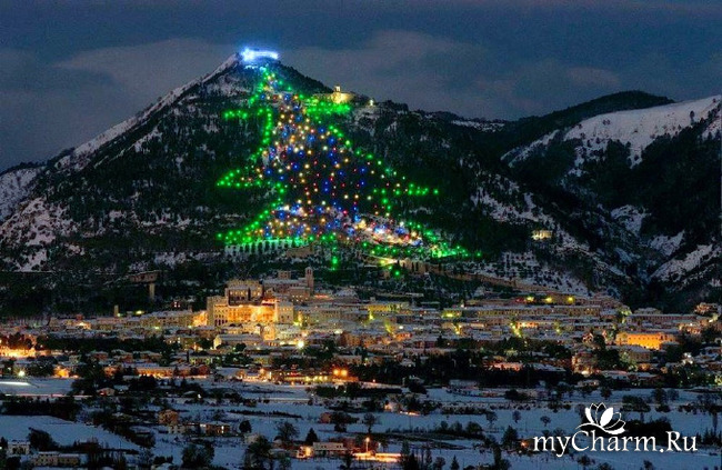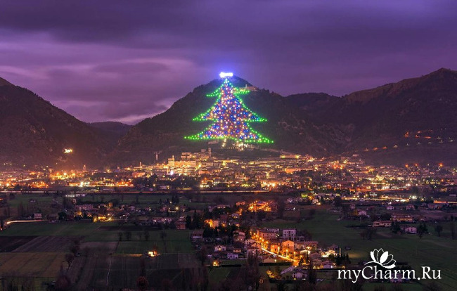 Можно смело сказать, что это самая большая в мире новогодняя и рождественская елка, ведь ее высота достигает целых 750 метров, а ширина – 450 метров. Но это совсем не гигантское дерево, а световая инсталляция, которая расположена на южном склоне горы Инджио, именно оттуда открывается вид на город Умбрия Губбио.