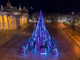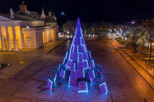 Композиция современной елки в Вильнюсе достигает 24 метров в высоту, украшена почти 4 километрами меняющих цвет рождественских гирлянд и 150 кв. м. светящихся зеркал. Внутренняя часть инсталляции представлена пышной зеленой елью, украшенной сосновыми шишками и фонариками.
