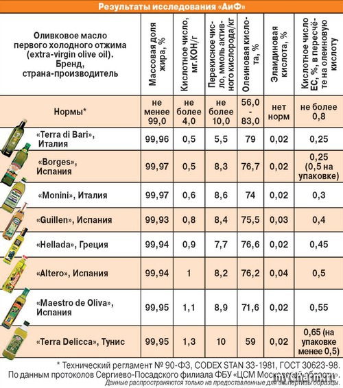 Все масла проверены действительно сделаны из оливок. Чем меньше элаидиновой кислоты в образце, тем лучше (в лаборатории определили её в количество от 0,2 до 0,4%). Ни в одном масле в лаборатории не нашли опасной концентрации тяжёлых металлов (проверяли на наличие кадмия, свинца, мышьяка, ртути, меди и железа).