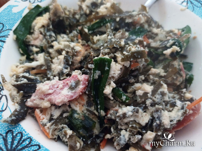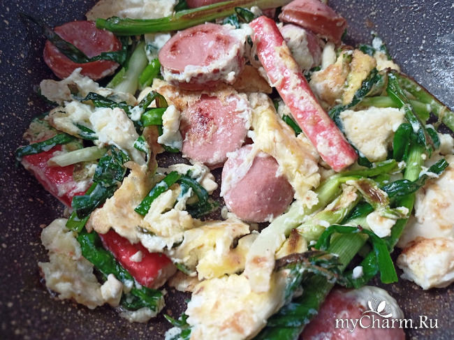 Вот например полюбилось мне давно такое блюдо - зеленый лук, крабовые палочки, сосиска натуральная и яйца.