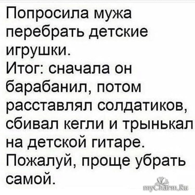 Добрый день, дорогие майшармельки! Улыбнёмся? "Внимание - рейтинг! Мы тут заглянули в наш магический стеклянный шар, до блеска отмытый в посудомоечной машинке, и он рассказал нам, какие мужчины самые хозяйственные по знаку Зодиака. 1 место: Дева. Боженька домашнего хозяйства. У него салфеток из микрофибры и губок для мытья посуды больше, чем у некоторых девчонок. 2 место: Телец... Читать полностью |