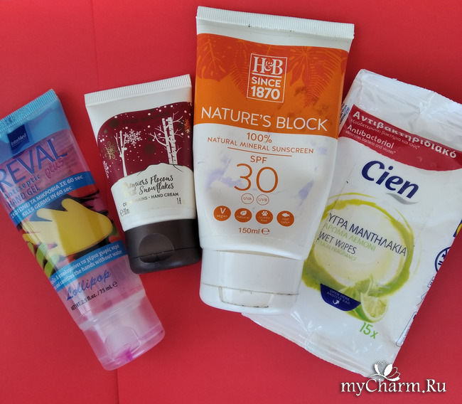 Антибактериальный гель для рук, сатфетки, также антибактериальные, крем для рук и крем от солнца.