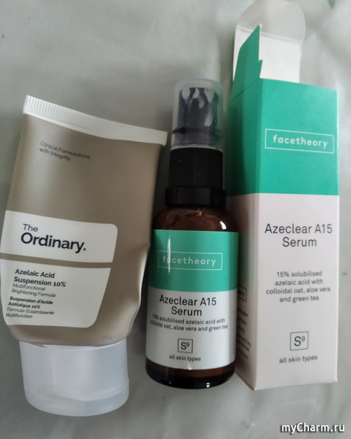 Сыворотка от Facetheory содержит 15% азелаиновой в базе из пропанедиола и экстрактов зелёного чая , алоэ . Мне не приятна эта сыворотка в использовании,но надо её закончить. Она расслаивается и перед нанесением нужно потрясти. Создаёт какую-то плёнку на коже.