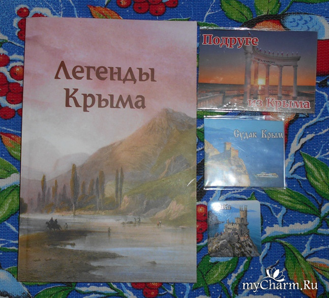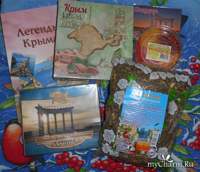 Доброго времени суток всем. Не так давно, ближе к концу прошлого года, моя подруга с семьей летала отдыхать в Крым. Оказывается она привезла мне подарки, мы долго не могли пересечься, к концу января наконец встретились. Вот что она мне подарила. Тут и книжечка, и чай, специи, мыло и халва с орехами. Традиционно магнитики.