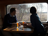 поезд ночной. люди приходят в вагон и сразу застилают спальное место и ложатся.