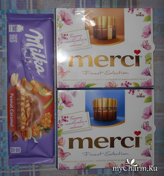 Сладкие подарки от различных коллег. Еще был конвертик с деньгами от моего структурного подразделения. Они были как раз, т. к. я купила себе джинсы.