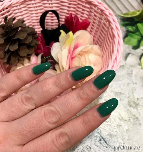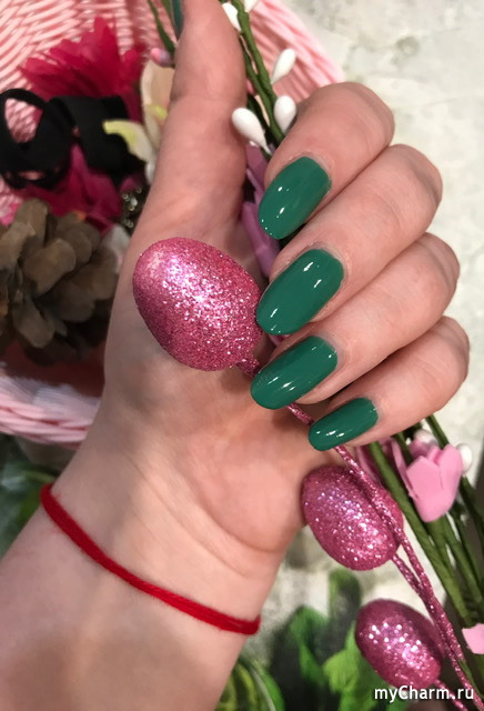 Так красиво смотрится сочетание зеленого лака с розовой корзинкой и цветами.