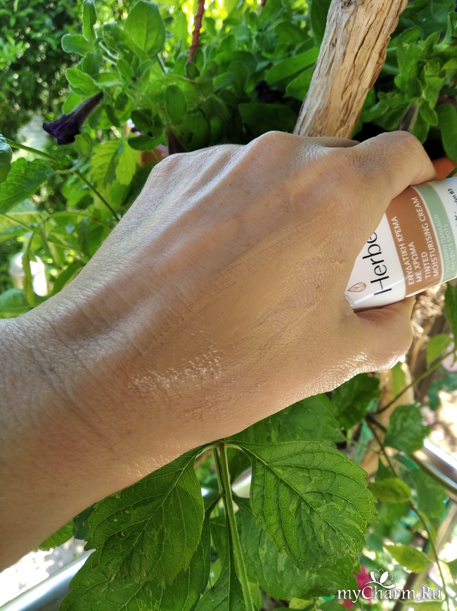 Здесь мы видим, что крем не течёт, но он очень пластичный и прекрасно распределяется по коже, без проплешин. Лёгкий тон придаёт коже еле заметный оттенок, при этом ничего не маскирует, не скрывает, но и не выглядит маской на лице. Это не тональник.