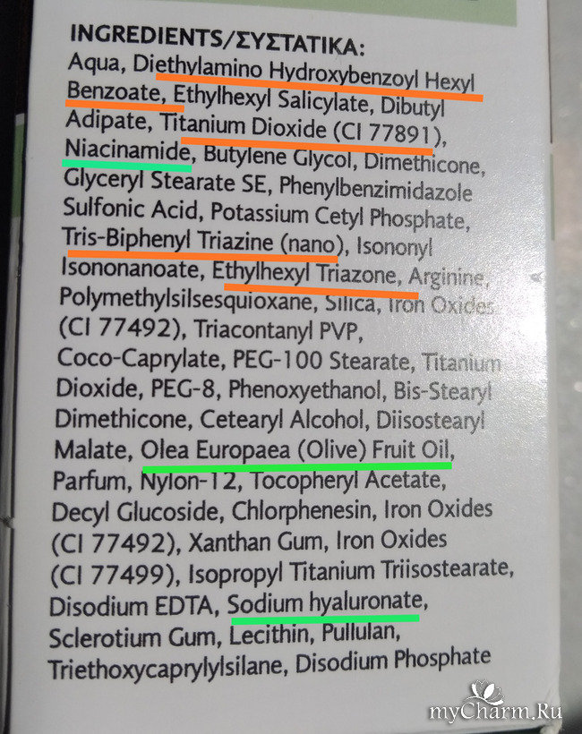 Смотрим на верхнюю строку состава--- красным подчеркнут фильтр Uvinul A Plus, который и направлен на защиту кожи от пигментации!