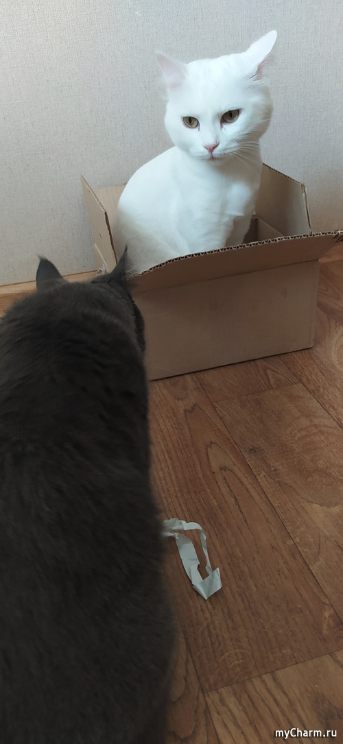 Мы недавно из магазина приехали с кучей пакетов, и плюс мой еще пару коробок прихватил, чтобы покупки сложить. Коты сразу встречают, а один в пустую уже коробку залез, и весь вид говорил, что ну наконец-то хозяева что-то по-настоящему путнее и нужное принесли!