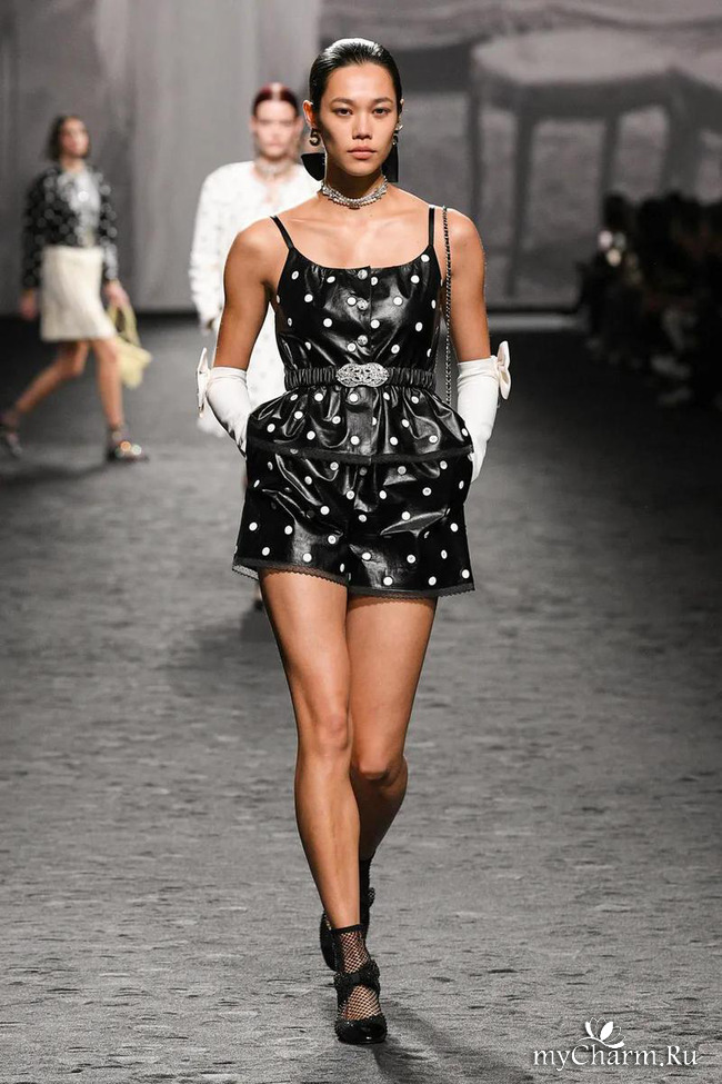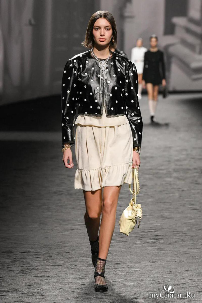 Фирменные твидовые костюмы получили более дерзкое прочтение благодаря декору в виде перьев и непривычному фасону, вечерние платья на тонких лямках дополнились ремнями-цепочками, а кружево выглядит ультрамодно вместе с крупными украшениями. Несмотря на то, что большую часть коллекции составили черно-белые луки, Виар не смогла отказать себе в удовольствии включить в нее образы в нежном розовом оттенке — самом трендовом цвете 2023.
