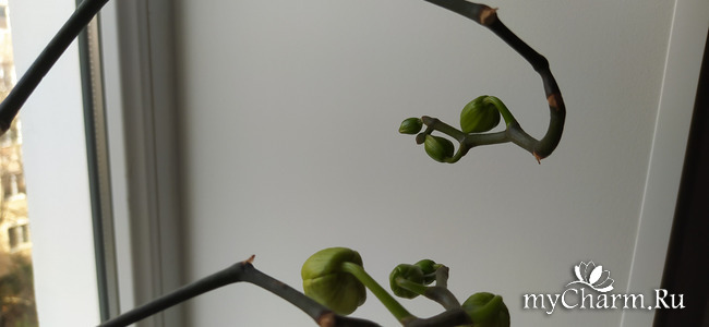 Итак, три старых цветоноса активно пошли в рост и три новых на одном цветочке - шесть цветоносов на одной орхидейке.