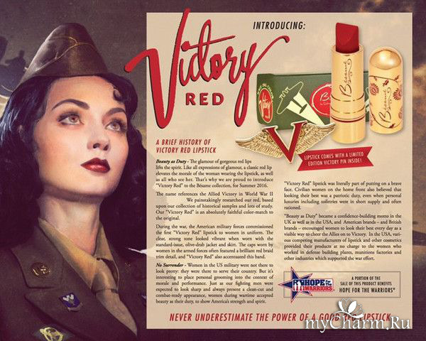 Когда началась Вторая мировая война, американская пресса начала агитировать женщин покупать тюбики помады, чтобы выразить несогласие с гитлеровскими взглядами. Элизабет Арден — та самая, которая сподвигла суфражисток на смелый шаг, даже создала оттенок Victory Red: