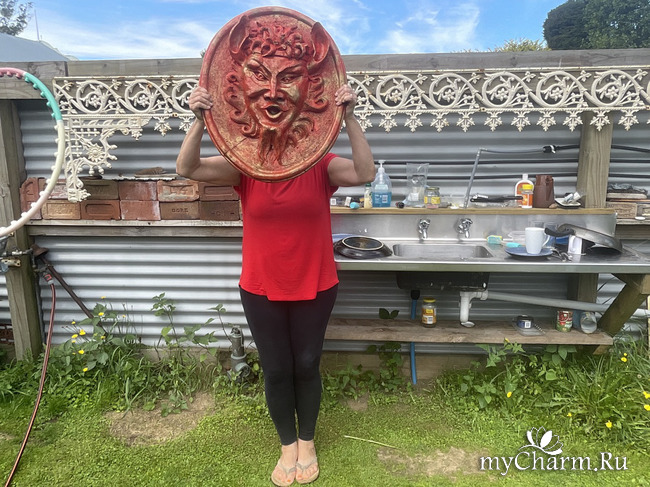 "Дай-ка, думаю, вытащу и открою. Это же знак!" - подумала я и решительно открыла коробку. Разогнав с барельефа садово-огородных непрошенных арендаторов и безжалостно вымыв струёй воды несимпатичных пауков с их гнездами, я разглядела, что это таки не Горгона, и даже не Медуза.