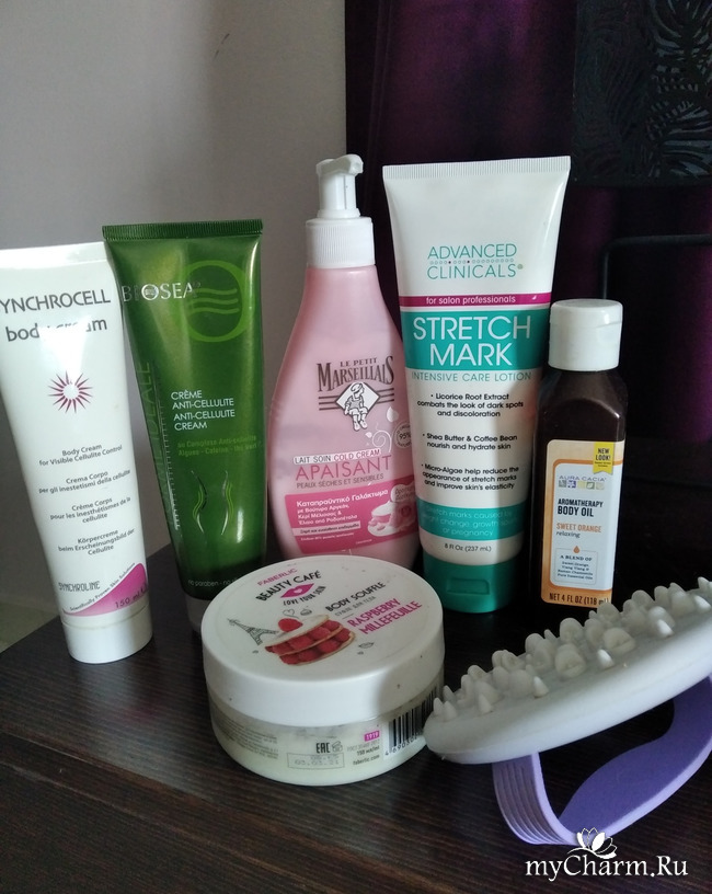 Средства для ухода за кожей тела: кремы от целлюлита и просто увлажняющие, масло, взбитое масло и массажёр от Орифлейм, которому " в обед сто лет" и который лучший из лучших.)))