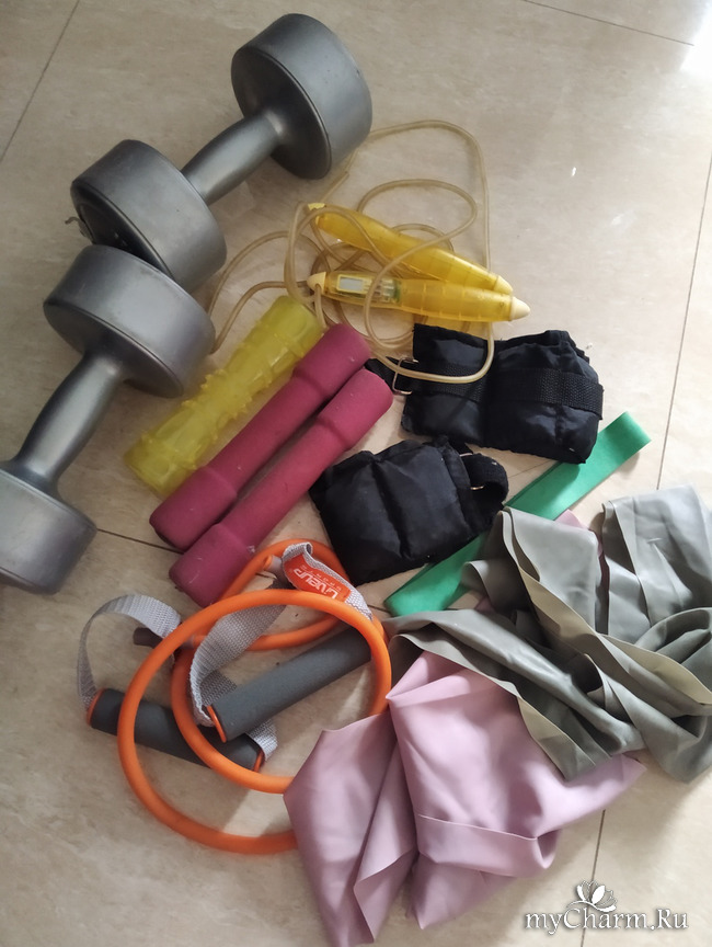 Спортивный инвентарь: гантели, резинки, эспандер, скакалка, утяжелители для ног/ рук.