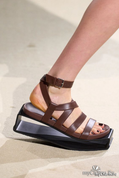 Платформа стала актуальной в прошлом летнем сезоне. И в том сезоне попадались модели обуви со скосом в носочной части, как в этой модели от Versace: