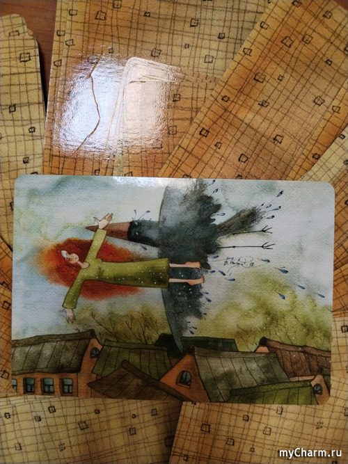 Я ассоциирую себя с этой девушкой посреди ангелов. В моей ситуации будет поддержка Высших сил (большая Птица) и моих Ангелов-Хранителей. Меня поднимут высоко и понесут далеко. Свобода, безопасность, радость и легкость. Вот что день грядущий мне готовит. Одна черная ворона - это мой страх. А вторая черная ворона - мои негативные темные мысли. Я их оставляю и не буду брать с собой. Даже если они какое-то время будут гнаться за нами, им явно не угнаться.