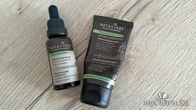Увлажняющая сыворотка и крем от Ботавикос. Увлажнение хорошее, но аромат розмарина и каких-то специй (в названии вербена и эвкалипт) не для всех подойдет.