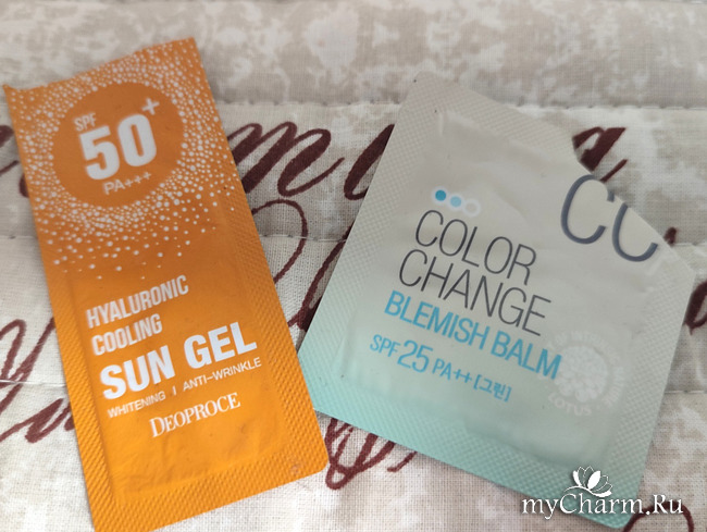 Мои пробники, очень понравились. Хотела купить полноразмер тот, что оранжевый гель с защитой 50. Но у меня сейчас еще есть другие пробники солнцезащитного крема, всё попробую и выберу.