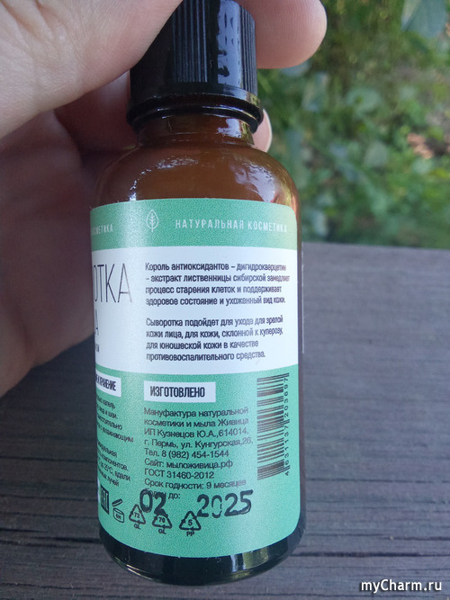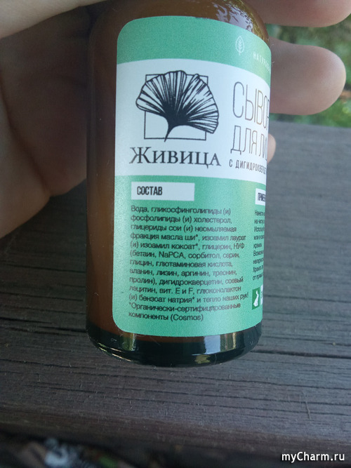 Заковыристое слово "дигидрокверцетин" - это экстракт лиственницы является мощным природным антиоксидантом. Он отлично защищает кожу от вредностей из вне и свободных радикалов, а также помогает коже не стареть, помогая ей регенерировать. Помимо этого, в состав сыворотки входят витамины, антибактериальные и противовоспалительные компоненты. То есть, её можно использовать не только при возрастной коже, но и подросткам с проблемной кожей, чтобы не допустить возникновения воспалений.