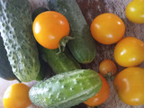 Огурцы тоже растут, и до сих пор ещё есть. Закрутила с десяток (или чуть больше) банок огурцов с помидорами и перцем.