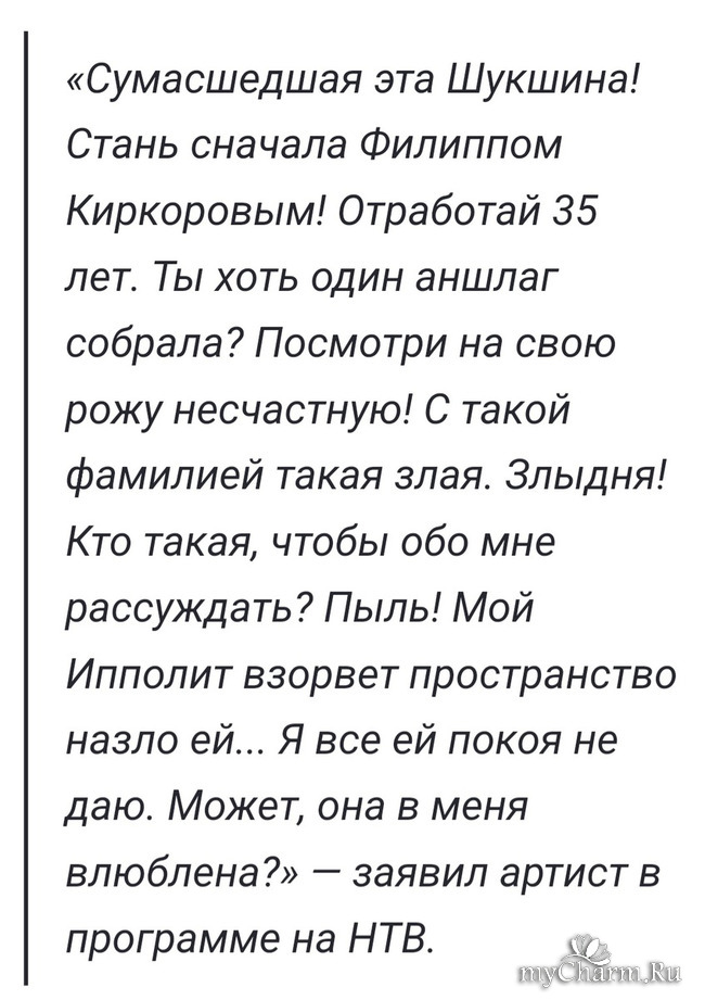 Киркоров не полез за острым словцом в свой сверкающий карман и назал М. Шукшину"пылью и мерзкой, никому не нужной злыдней"