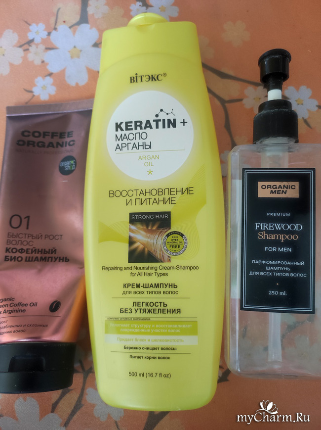 Шампуни слева направо. Кофейный - неплох, но промывает не с первого раза. Витекс - идеальный, а с учетом объема практически нескончаемый. Шампунь мужа тоже хороший